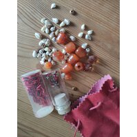 Konvolut von verschiedenen Perlen und Müschelchen mit Samtsäckchen.. Die Aufnähstifte sind von Gütermann, zum Versand würde ich sie in ein ... mehr