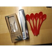 3 x 8 Holzbesteck-Box (Messer, Gabeln, Löffel) + 20er Holz- Einwegmesser + 5 rote Kunststoff Kaffeelöffel,