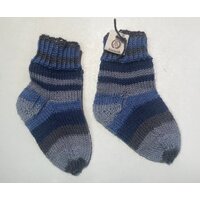 Handgestrickte extra kleine Babysocken aus Sockenwolle von Woll Butt "Milos" in verschiedenen Blautönen und grau. Feines Bündchen am Beinabschluss