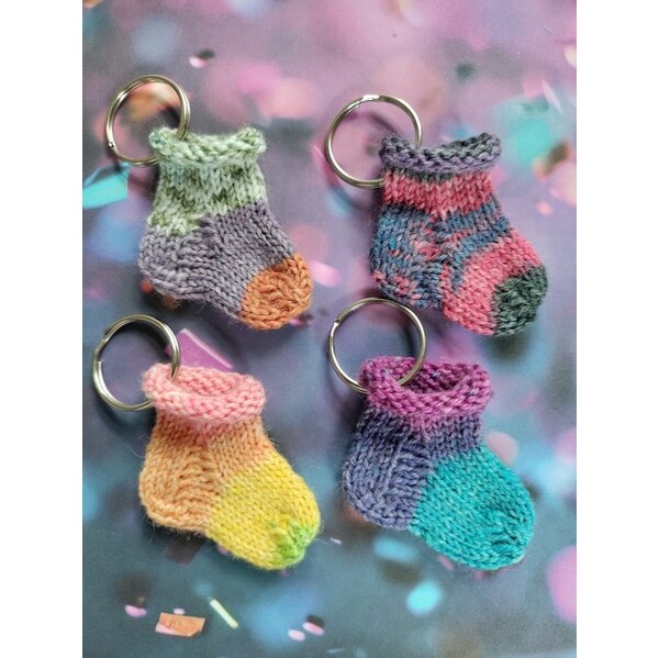 vier kleine Söckchen als Schlüsselanhänger, selbstgestrickt aus Sockenwolle