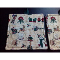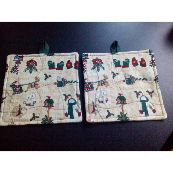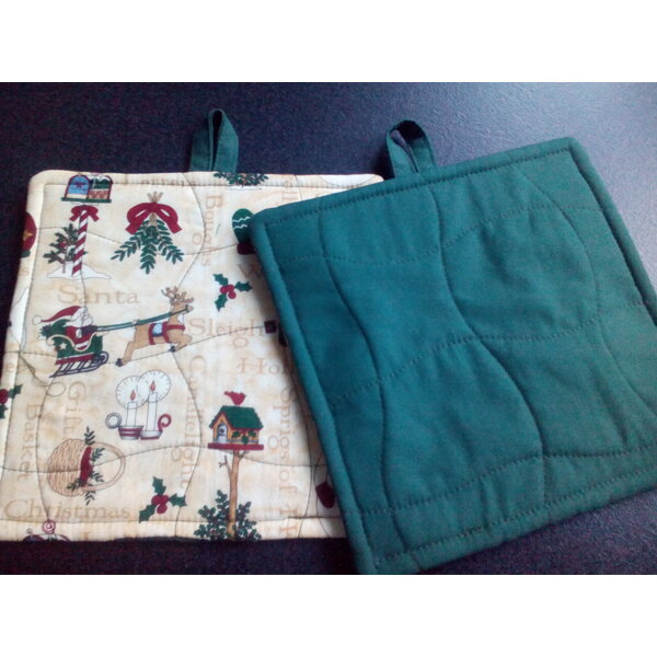 Diese Topflappen wurden aus einem weihnachtlichen Patchwork-Baumwollstoff von der Desihnerin Teresa Kogut genäht und mit einem grünen Baumwollstoff für die Rückseite verstürzt. Sie sind mit Thermolam doppelt wattiert. Ein besonderer Blickfang ind der Küche in der Weihnachtszeit.