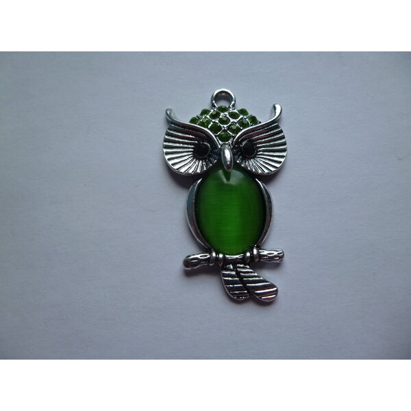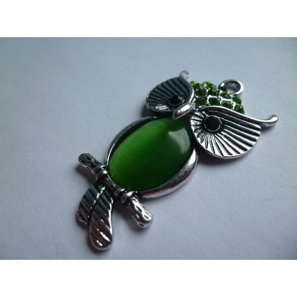 Die Eule hat am Kopf kleine grüne Strasssteinchen. Der Bauch besteht aus einem Cateye- (Katzenaugen-) stein, der wunderschön changiert. Der Rest ist aus Metall.