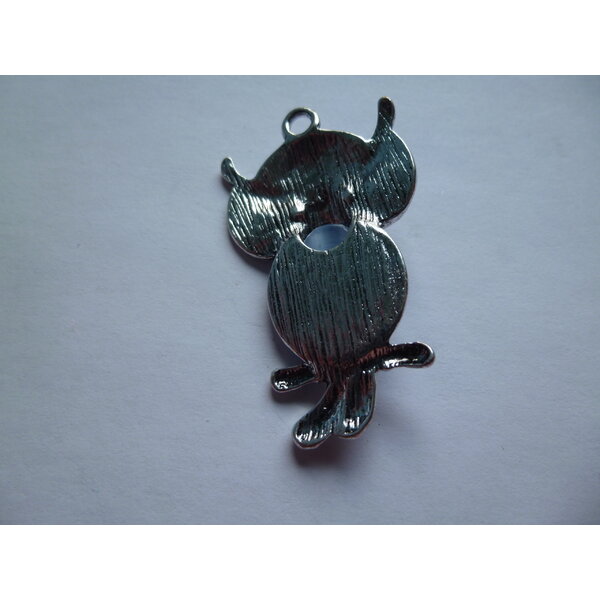 Die Eule hat am Kopf kleine blaue Strasssteinchen. Der Bauch besteht aus einem Cateye- (Katzenaugen-) stein, der wunderschön changiert. Der Rest ist aus Metall.
