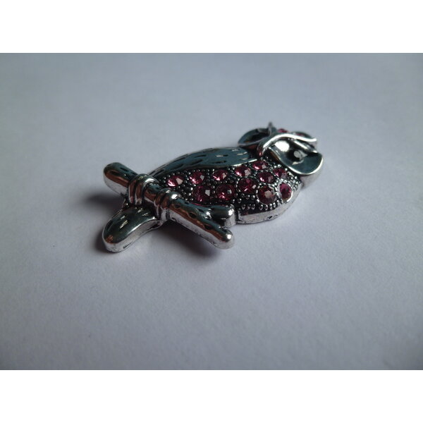 Die Eule hat am Kopf und am Körper kleine rosafarbene Strasssteinchen. Der Rest ist aus Metall.